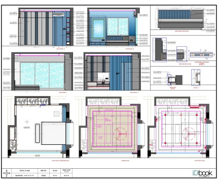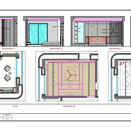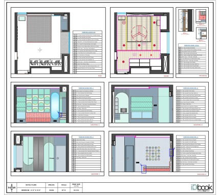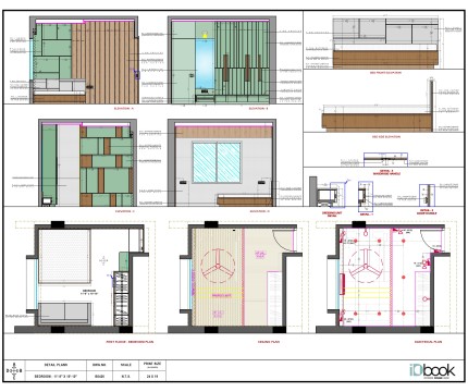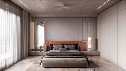 The overall colour scheme of this bedroom is kept minimal yet eclectic. Here, the neon-red feature wall along with tiles and wooden patti acts as the main backdrop of the entire room. The soft tones of grey, white and light brown help in balancing the neon-red, keeping it modern and chic. The bed is kept white and framed with wooden patti giving it an edge as well as keeping it simple.
