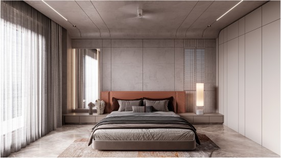 A serene and elegantly designed bedroom that embraces soft neutral tones and warm accents to create a peaceful retreat. Minimalist wall treatments, subtle textures, and refined lighting details enhance the sense of openness and calm, while generous natural light adds to the soothing ambiance. Thoughtfully curated furnishings and a streamlined layout ensure both comfort and functionality, making this bedroom a refined sanctuary ideal for rest and relaxation in a contemporary luxury home.
