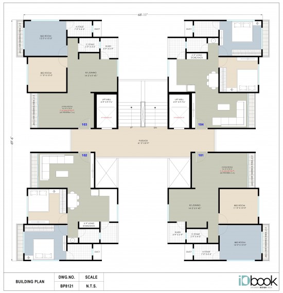 The typical Layout has 4 flats of 664 sq.ft. Each on a singular floor. The cozy Living room has clear vision glass windows. Also, have connected dining & kitchen area with sufficient space with 2BHK provision.