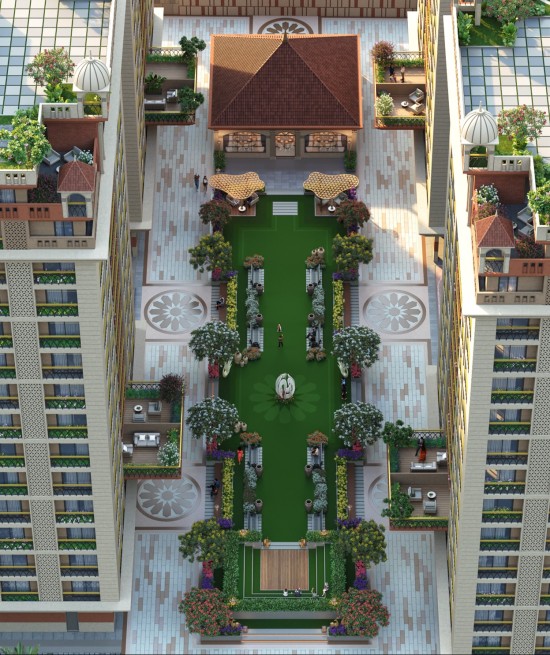 A grand, axial courtyard inspired by classical Indian elegance, designed as the ceremonial heart of the residence. A lush central green promenade is framed by symmetrical pathways, manicured gardens, and vibrant floral beds, creating a strong sense of order and refinement. Elegant seating niches and shaded decks along the edges invite quiet strolls, conversation, and relaxation. The pavilion at the focal end anchors the space with a regal presence, making the courtyard ideal for community gatherings, celebrations, and everyday moments of calm within a timeless, heritage-inspired setting.