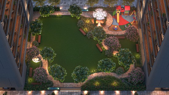 This beautifully landscaped courtyard is designed as a peaceful green retreat within the residential complex,offering a perfect blend of nature, comfort, and community living. A lush central lawn forms the heart of the space,surrounded by curved pathways, flowering shrubs, and mature trees that create a soft, welcoming atmosphere throughout the day.Thoughtfully placed seating areas invite residents to relax, socialize, or enjoy quiet moments outdoors, while subtle water features and ambient lighting enhance the sense of calm, especially in the evening.A dedicated children’s play zone adds vibrancy and energy, making the courtyard engaging for families while remaining safe and well-organized. Framed by the residential towers,this courtyard functions as a serene communal hub—encouraging everyday leisure, connection, and a balanced urban lifestyle.