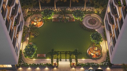 This beautifully curated landscaped courtyard is designed as a serene retreat for residents of all ages.Anchored by expansive green lawns, the space seamlessly blends nature, wellness, and community living. A thoughtfully placed gazebo seating area offers a peaceful corner for relaxation, conversations,or quiet moments amidst lush greenery.At the heart of the courtyard, a sculptural water feature adds a sense of calm and visual elegance, enhancing the overall ambiance. Meandering pathways, tiered seating edges, and soft landscape contours create an inviting environment for leisurely walks and informal gatherings. The open layout encourages children to play freely while allowing adults to unwind within clear, safe sightlines.Surrounded by modern residential towers and complemented by subtle landscape lighting,this courtyard functions as a central social and wellness hub—a harmonious blend of tranquility, activity, and everyday comfort that elevates the living experience.