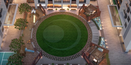This beautifully planned circular courtyard forms the vibrant heart of the residential community.Designed around a lush, concentric green lawn, the space creates a strong sense of balance, unity and openness. The circular form naturally encourages movement, interaction, and visual harmony, making it an inviting focal point for residents of all ages.Surrounded by elegant walkways, seating niches, and thoughtfully placed pergolas,the courtyard offers comfortable spots for relaxation and social gatherings. Soft landscape lighting, water features, and flowering trees enhance the ambience during the evening, while a dedicated children’s play zone adds a lively, family-oriented character. Framed by the residential towers, this courtyard functions as a serene yet active communal hub—blending nature,recreation, and modern living into one cohesive experience.