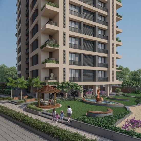 This beautifully curated landscaped courtyard is designed as a serene retreat for residents of all ages.Anchored by expansive green lawns, the space seamlessly blends nature, wellness, and community living. A thoughtfully placed gazebo seating area offers a peaceful corner for relaxation, conversations,or quiet moments amidst lush greenery.At the heart of the courtyard, a sculptural water feature adds a sense of calm and visual elegance, enhancing the overall ambiance. Meandering pathways, tiered seating edges, and soft landscape contours create an inviting environment for leisurely walks and informal gatherings. The open layout encourages children to play freely while allowing adults to unwind within clear, safe sightlines.Surrounded by modern residential towers and complemented by subtle landscape lighting,this courtyard functions as a central social and wellness hub—a harmonious blend of tranquility, activity, and everyday comfort that elevates the living experience.