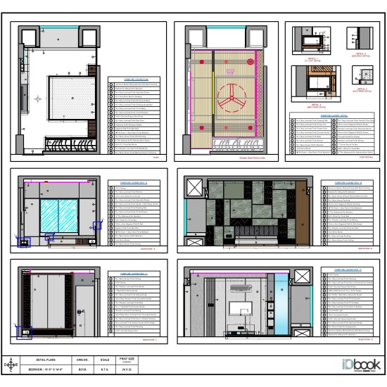 This bedroom is a refined blend of modern luxury and warm sophistication. The feature wall showcases a striking composition of marble-textured panels and rich wooden inlays, accented with subtle brass lines that add depth and elegance.Soft, recessed lighting highlights the textures, creating a calm yet visually engaging atmosphere.The low-profile bed with plush upholstery anchors the space, complemented by neutral linens and earthy accent cushions for a balanced,cozy feel. Sleek built-in wardrobes with clean lines enhance functionality while maintaining a seamless, uncluttered look. Finished with polished marble flooring and a muted color palette, the room offers a serene, contemporary retreat designed for comfort, style, and understated luxury.